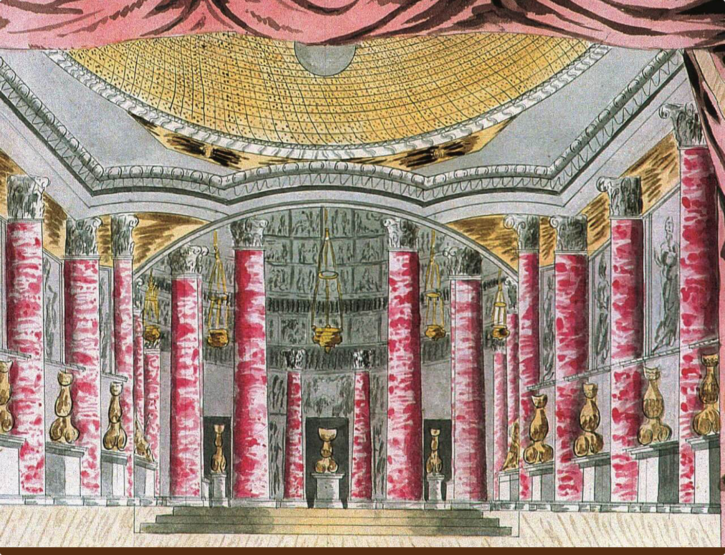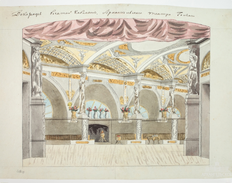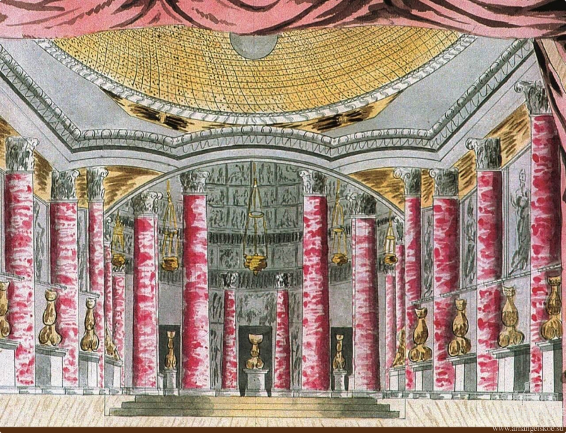 Князь Н.Б. Юсупов (1751–1831), задумав устроить усадебный театр в Архангельском, отклонил проекты московских зодчих и обратился к итальянскому мастеру Пьетро ди Готтардо Гонзага (1751–1831).