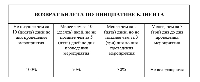 Возврат стоимости билетов менее чем за 3 дня до начала мероприятия не производится. Во время проведения либо после проведения мероприятия билеты к возврату по инициативе посетителя не принимаются.